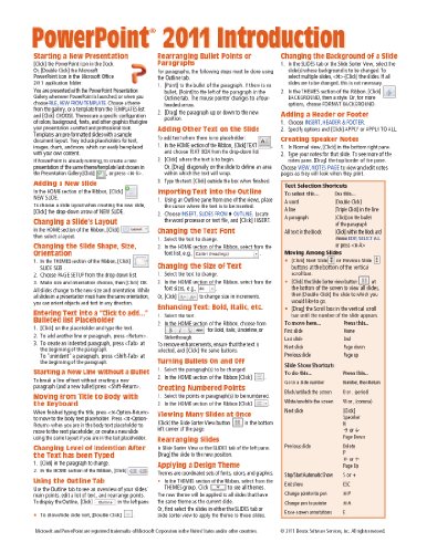 Laminated quick reference card showing step-by-step instructions and shortcuts for Microsoft PowerPoint 2011 for Mac. This guide is suitable as a training handout, or simply an easy to use reference guide, for any type of user.The following topics are covered: